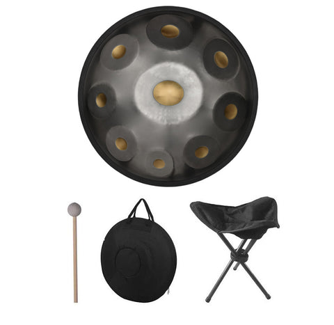 MiSoundofNature High-end King Handpan Drum G Minor 18 Inch 9 Notes--Severe quenching heat treatment --The material is more high-end and the sound is more beautiful. HluruShop Hand pan drum is a musical instrument in the idiophone class. It is constructed from two half-shells of deep drawn, with hollow inside and in the shape of a convex lens. The top ("Ding") side has a center 'note' hammered into it and seven or eight 'tone fields' hammered around the center. The bottom ("Gu") is a plain surface that has a rolled hole in the center with a tuned note that can be created when the rim is struck.