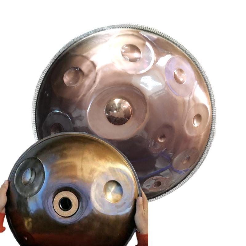 HluruShop Hand pan drum is a musical instrument in the idiophone class. It is constructed from two half-shells of deep drawn, with hollow inside and in the shape of a convex lens. The top ("Ding") side has a center 'note' hammered into it and seven or eight 'tone fields' hammered around the center. The bottom ("Gu") is a plain surface that has a rolled hole in the center with a tuned note that can be created when the rim is struck.