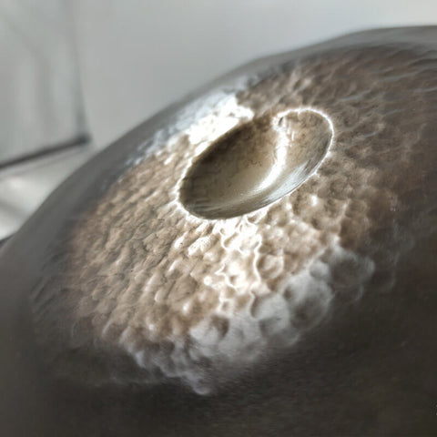 HluruShop Hand pan drum is a musical instrument in the idiophone class. It is constructed from two half-shells of deep drawn, with hollow inside and in the shape of a convex lens. The top ("Ding") side has a center 'note' hammered into it and seven or eight 'tone fields' hammered around the center. The bottom ("Gu") is a plain surface that has a rolled hole in the center with a tuned note that can be created when the rim is struck.